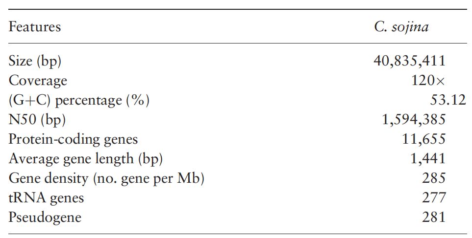 ? ? ? 由Cercosporasojina?Hara引起的大豆灰斑病是世界上大多數(shù)大豆種植國家的常見大豆病。大豆灰斑病的致病因子是一種大豆破壞性病原體??刂七@種疾病的主要措施是培育抗性大豆品種或施用化學(xué)殺菌劑,由于病原體的進化和基因突變,施用化學(xué)殺真菌劑通常在田間迅速失去作用。大豆灰斑病導(dǎo)致大豆產(chǎn)量降低。因此,獲取Cercospora sojina?Hara基因組的信息對研究大豆的感染機制及提高大豆產(chǎn)量等尤為重要。