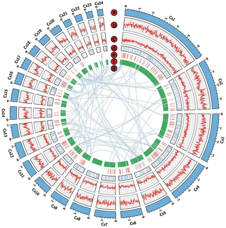 使用CANU從頭組裝測序數(shù)據(jù)(4,920,479,113bp clean reas),N50長度為1.59Mb,總組裝大小約為40.84Mb(表1)。通過circos-plot顯示了24個最大的支架(圖1)。預(yù)測共11,655個蛋白質(zhì)編碼基因,其基因密度為每1 Mb約285個基因。在基因組中預(yù)測了277個tRNA和281個假基因。RNA-seq數(shù)據(jù)顯示有8,474個推定的蛋白質(zhì)編碼基因。