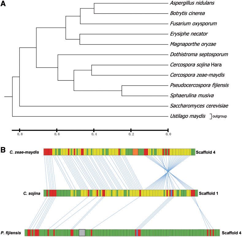 利用一組真菌的系統(tǒng)發(fā)育骨架基因分析了C. sojina和其他真菌物種的進化關(guān)系。系統(tǒng)發(fā)育分析表明C. sojina在進化上接近于尾孢菌(Cercospora zeae-maydis),一種可引起玉米葉斑病的植物病原體(圖3A)。此外,C. sojina也接近其他三個病原體Pseudocercospora fijiensis,Sphaerulina musivaDothistroma septosporum(圖3A)。
