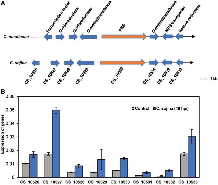 尾孢菌(Cercosporasojina)基因組編碼16個非核糖體肽合成酶(NRPS),20?個PKS,18個脂肪酸合成酶,3個萜烯合酶,2?個geranylgeranyl二磷酸合成酶和1種萜類化合物環(huán)化酶。這些酶參與次級代謝產(chǎn)物的合成,包括霉菌毒素,色素和生物堿。在C. sojina基因組中鑒定了一個具有8個尾孢菌素生物合成基因的類似基因簇。(圖4A)。這八個基因顯示高氨基酸序列與煙草(C. nicotianae)尾孢菌素生物合成基因的相似性在相同的串聯(lián)順序中(圖4A)。此外,我們觀察到感染期間8種基因的轉(zhuǎn)錄增加(圖4B)。