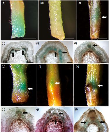 GUS信號(hào)在剪切后的0h主要在莖形成層和未成熟的木質(zhì)部存在,隨后在不定根誘導(dǎo)的2天后,越來越多的GUS信號(hào)聚集在形成層和次生韌皮部,3~4天,形成層、次生韌皮部和皮層的不定根原基細(xì)胞中出現(xiàn)GUS信號(hào)。在不定根誘導(dǎo)5天后,GUS信號(hào)在不斷增大的根原基逐漸降低并在第六天消失。結(jié)果表明,PagFBL1會(huì)參與不定根生成的初期階段,如誘導(dǎo)和萌生期,可參與生長素信號(hào)通路從而調(diào)控不定根的誘導(dǎo)和萌生。