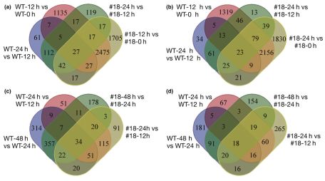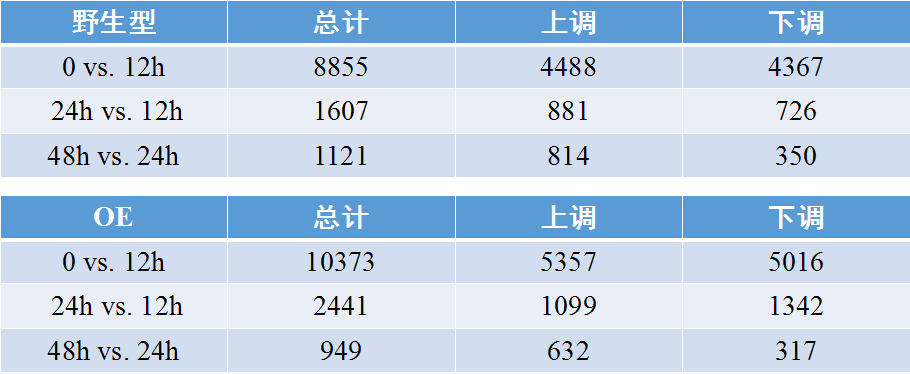 使用Illumina測(cè)序技術(shù)進(jìn)行轉(zhuǎn)錄組分析從而鑒定影響不定根生成的差異表達(dá)基因。不論在野生型還是過表達(dá)植株里,0h與12h的差異表達(dá)基因均多于12h vs. 24h和24h vs. 48h比較組。因此,在不定根誘導(dǎo)和萌發(fā)的前12h發(fā)生了大量基因的重塑。OE植株在前12h增加1518個(gè)差異表達(dá)基因,其中有119個(gè)基因在野生型的12h vs. 24h中出現(xiàn)(圖3)。這些結(jié)果表明,PagFBL1基因的高表達(dá)會(huì)增強(qiáng)促進(jìn)不定根形成的基因的表達(dá)變化。