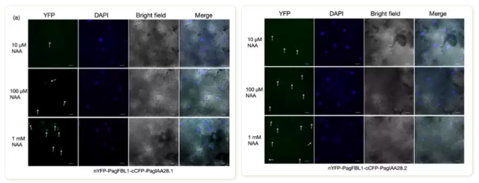 使用雙分子熒光互補(bǔ)技術(shù),將15個(gè)Aux/IAA基因共轉(zhuǎn)染到煙草葉片,發(fā)現(xiàn)只有在nYFP-PagFBL1與?cCFP-PagIAA28.1?和cCFP-PagIAA.28.2共轉(zhuǎn)染后(圖5a)才會(huì)發(fā)現(xiàn)YFP熒光蛋白信號(hào),且生長素濃度越高,信號(hào)越強(qiáng),而在其他組合中,只發(fā)現(xiàn)了DAPI信號(hào)(圖5b)。