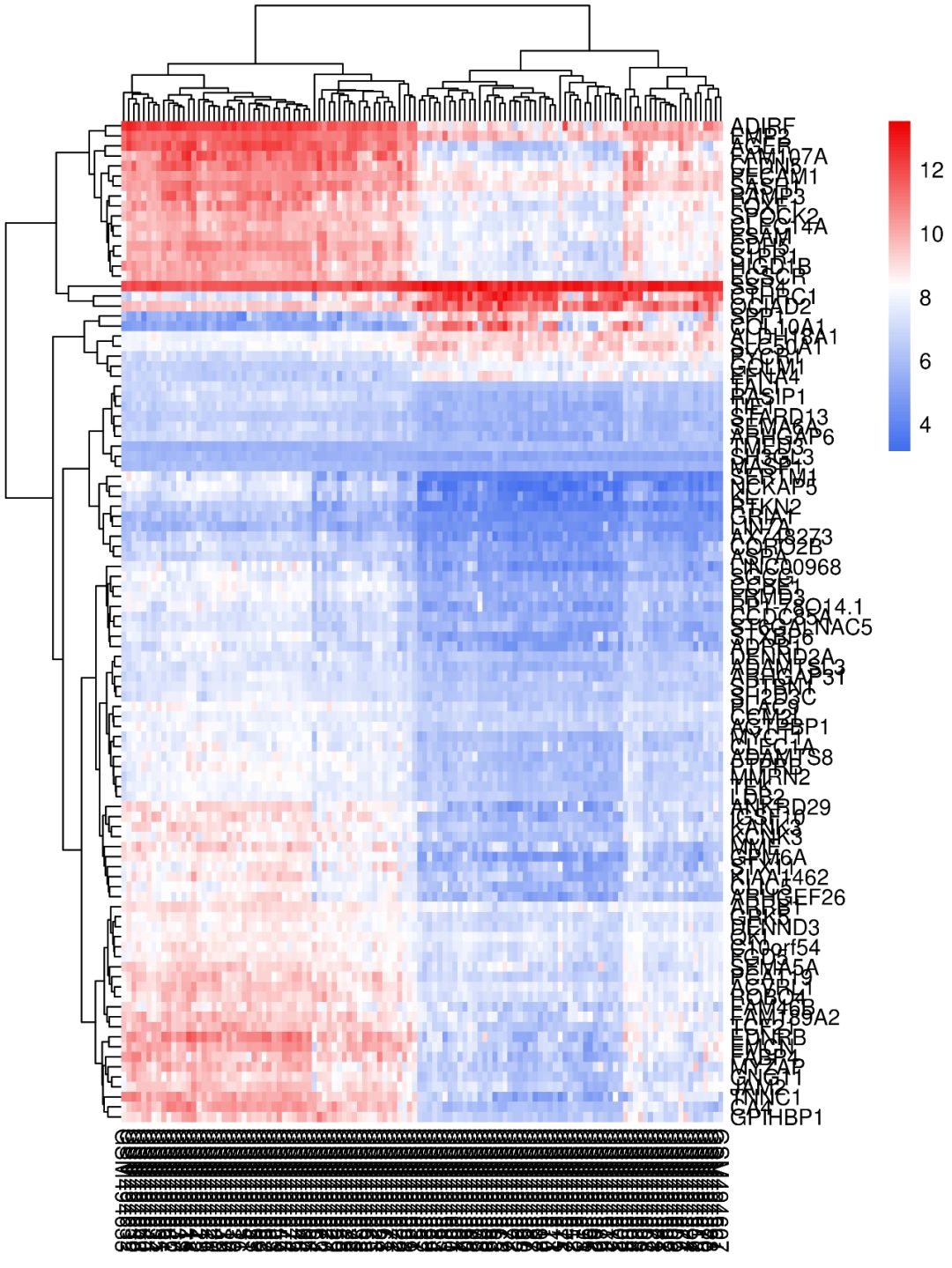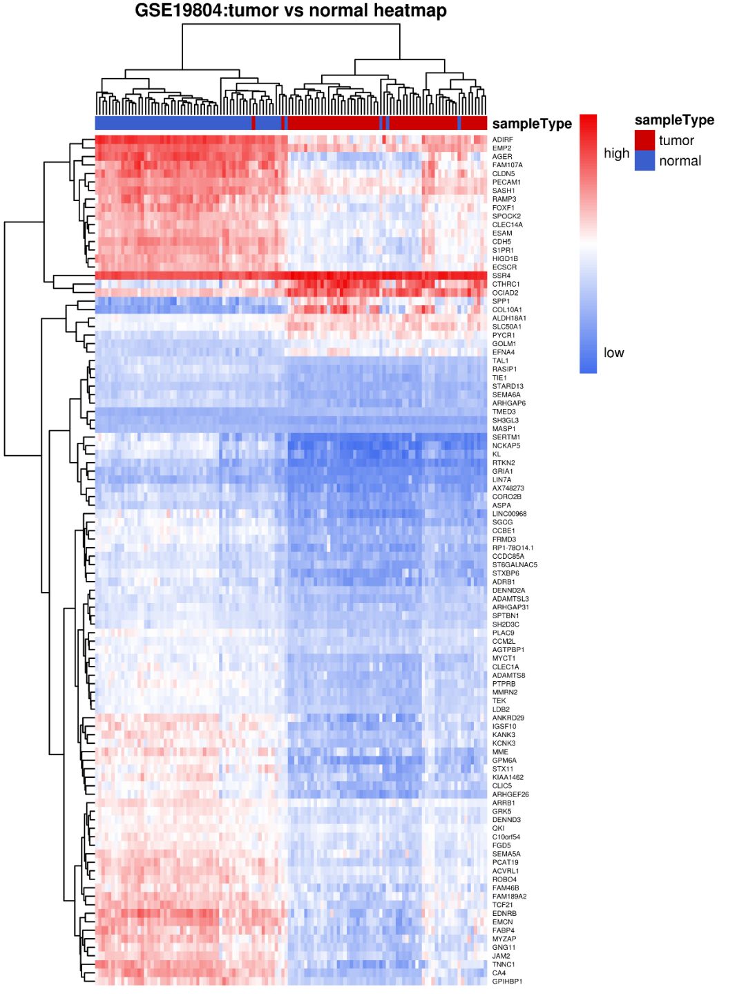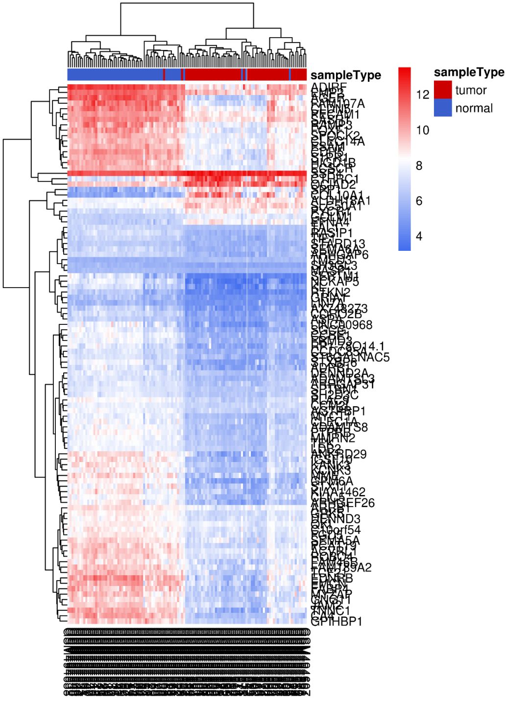 此次例子,我們選擇了一套GEO數(shù)據(jù)庫的肺癌數(shù)據(jù),數(shù)據(jù)編號為GSE19804,120個(gè)樣本,其中包含60個(gè)癌癥樣本和60個(gè)癌旁正常樣本,前面我們使用t檢驗(yàn),并對p值進(jìn)行BH校正,篩選fdr小于0.01的基因中前100個(gè)在癌癥相對于正常樣本中顯著差異表達(dá)的基因進(jìn)行熱圖繪制。