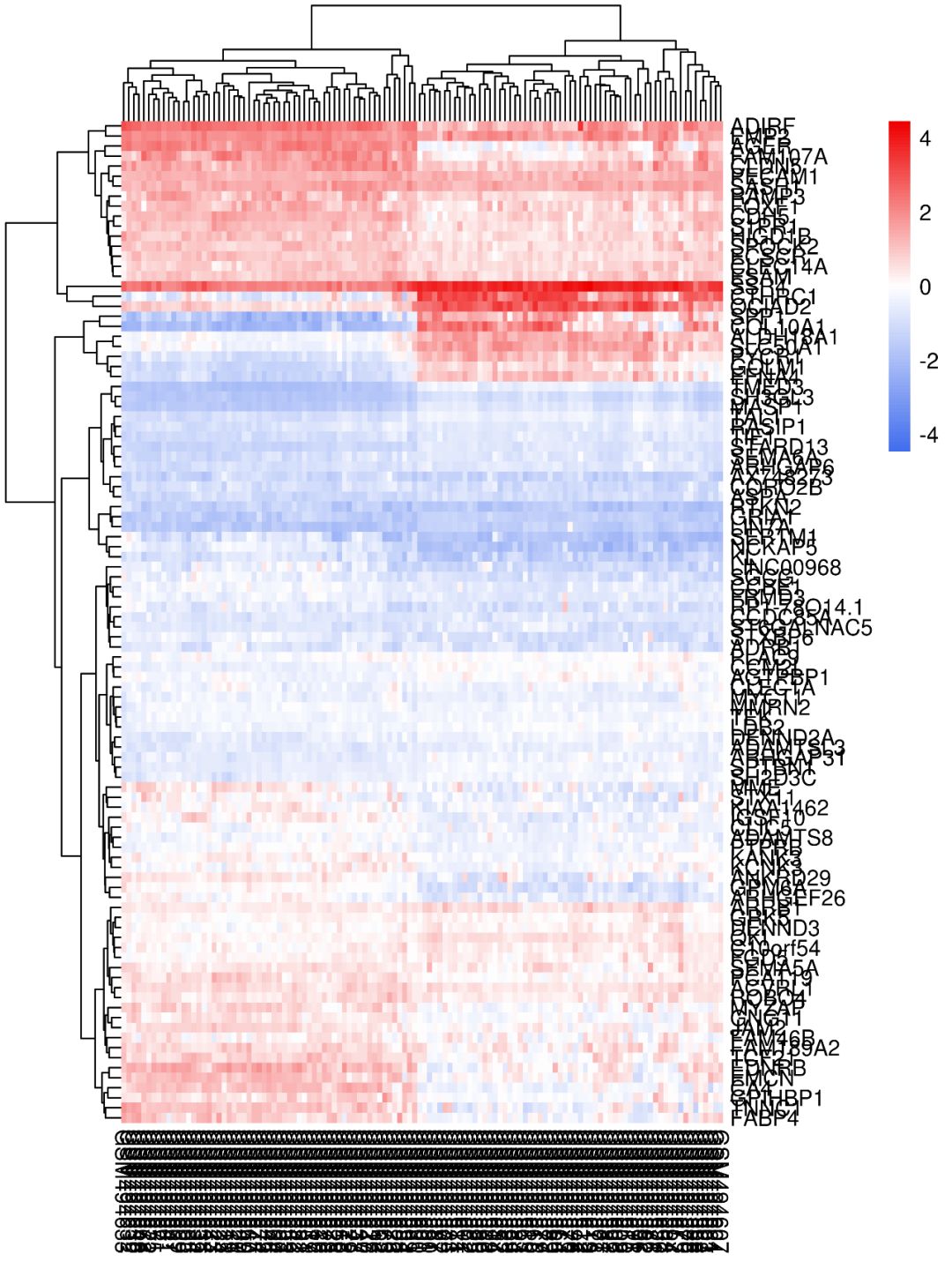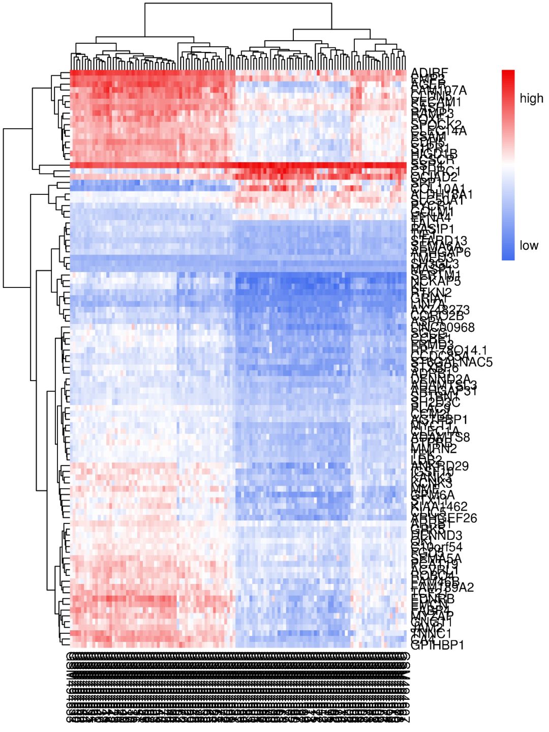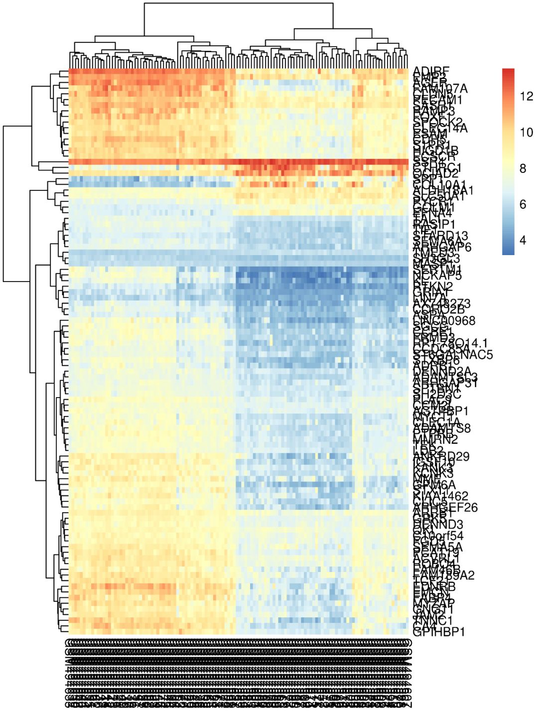 此次例子,我們選擇了一套GEO數(shù)據(jù)庫的肺癌數(shù)據(jù),數(shù)據(jù)編號為GSE19804,120個(gè)樣本,其中包含60個(gè)癌癥樣本和60個(gè)癌旁正常樣本,前面我們使用t檢驗(yàn),并對p值進(jìn)行BH校正,篩選fdr小于0.01的基因中前100個(gè)在癌癥相對于正常樣本中顯著差異表達(dá)的基因進(jìn)行熱圖繪制。
