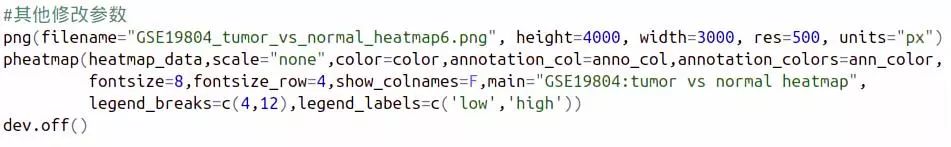 我們修改了字體大小,不顯示樣本名,以及設(shè)置圖片標(biāo)題,到此時(shí),經(jīng)過一系列參數(shù)更改,是不是已經(jīng)比一開始使用默認(rèn)參數(shù)好看多了呢?(可以增加一個(gè)對比圖,GSE19804_tumor_vs_normal_heatmap6.png與GSE19804_tumor_vs_normal_heatmap1.png的 對比)。