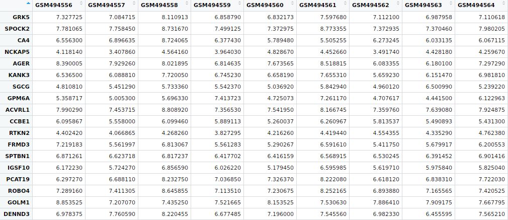 我們現(xiàn)在將數(shù)據(jù)進(jìn)行行均一化,聚類方法選擇complete,進(jìn)行均一化之后的熱圖還沒有前面的好看,查看數(shù)據(jù)表達(dá)情況,我們發(fā)現(xiàn)最小的表達(dá)值3.149和最大的表達(dá)值13.533之間并沒有相差很大,因此這套數(shù)據(jù)其實(shí)不適合做均一化處理,畫出來的熱圖更好看。