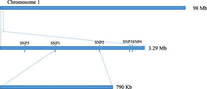 ? ? ? 由于3.29Mb區(qū)間仍包含大量基因,作者進(jìn)一步開發(fā)出16個(gè)KASP標(biāo)記,其中5個(gè)有效的KASP標(biāo)記用于147個(gè)單株(141個(gè)來(lái)自F2,6個(gè)來(lái)自F1,Ontario792?與Moneymaker)的基因分型。對(duì)Ontario792,Moneymaker與F1群體的KASP分型結(jié)果與測(cè)序結(jié)果一致,暗示測(cè)序結(jié)果與KASP分型是可靠的。接著,利用遺傳圖譜及KASP標(biāo)記將定位區(qū)間鎖定在SNP1與SNP2之間(790kb,圖4.)。幸運(yùn)的是,這個(gè)區(qū)間只有一個(gè)注釋基因Solyc01g007130.3,編碼受體蛋白激酶TMK1,其中含有一個(gè)LRR基序,這是抗病基因的一般特征,暗示Solyc01g007130.3是Cf-10抗病候選基因。然而,基于重測(cè)序數(shù)據(jù)在兩親本間并沒有發(fā)現(xiàn)Solyc01g007130.3中存在SNPs或InDels,進(jìn)一步利用Sanger測(cè)序也沒有發(fā)現(xiàn)序列間差異。盡管如此,這并不能排除親本間存在甲基化修飾的差異,并且此基因上游啟動(dòng)子等調(diào)控序列可能也存在著變異。
