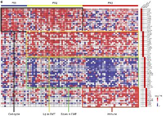 該研究共鑒定到11340個(gè)不同的基因產(chǎn)物,覆蓋了腫瘤細(xì)胞及腫瘤微環(huán)境所有可能表達(dá)的蛋白。研究人員對(duì)胃癌與癌旁組織全蛋白表達(dá)譜進(jìn)行聚類分析,將彌漫型胃癌分為三個(gè)分子亞型(PX1~3),且這三個(gè)亞型與生存預(yù)后和化療敏感性密切相關(guān)。這是世界上實(shí)現(xiàn)在蛋白層面上對(duì)腫瘤進(jìn)行分子分型,且分的的亞型與預(yù)后和化療有顯著性關(guān)聯(lián)。其中PX1型(細(xì)胞周期型),總生存時(shí)間最長(zhǎng);PX2型 (上皮-間充質(zhì)轉(zhuǎn)化型),生存預(yù)后介于PX1和PX3之間;PX3 (免疫通路富集型)患者腫瘤組織高表達(dá)蛋白富集在免疫響應(yīng)相關(guān)通路和EMT相關(guān)蛋白上,總生存時(shí)間最短,并且該組患者對(duì)化療不敏感。