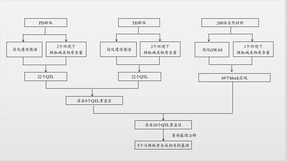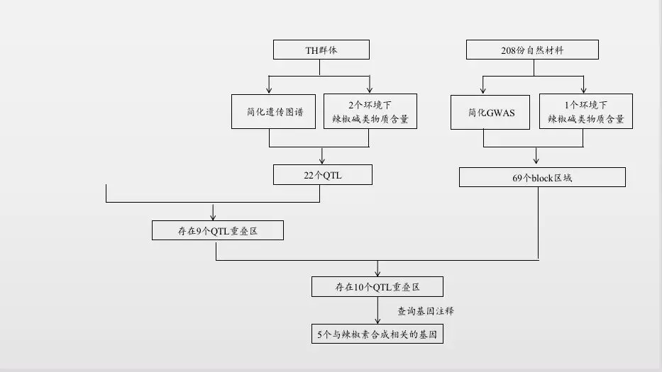聯(lián)合分析結(jié)果:基于相同的參考基因組,通過比較QTL分析與GWAS分析的定位結(jié)果的物理位置發(fā)現(xiàn)GWAS結(jié)果中10個(gè)區(qū)域與本研究QTL定位結(jié)果重疊,查詢注釋結(jié)果,發(fā)現(xiàn)5個(gè)基因與辣椒素生物合成途徑相關(guān)基因。