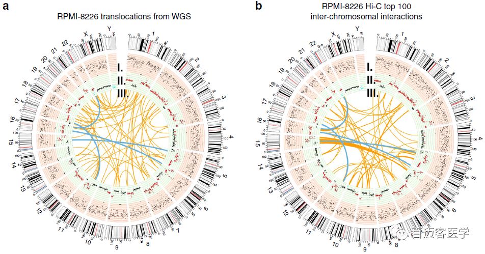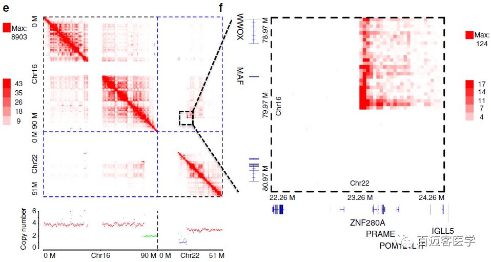 在RPMI-8226中,WGS鑒定出56個(gè)染色體間易位事件,其中四個(gè)也在top?100的Hi-C染色體間互作中,其中包括RPMI-8226的光譜核型(SKY)圖像中檢測(cè)到t(16,22)(q23,q11)的易位,涉及MM相關(guān)基因WWOXMAF。在U266細(xì)胞中,鑒定到了80個(gè)受易位事件影響的基因,包括癌癥相關(guān)基因TNIK、FBXW7、TRIM2,其中包含一些之前研究未發(fā)現(xiàn)的MM相關(guān)基因。此外距離易位位點(diǎn)1 Mb的基因中,有一半以上是相比于正常B細(xì)胞差異表達(dá)的。MM細(xì)胞系的染色體間整體互作count明顯高于正常B細(xì)胞??偟膩?lái)說(shuō),這些結(jié)果表明,癌細(xì)胞基因組三維構(gòu)象受到染色體間易位的影響。