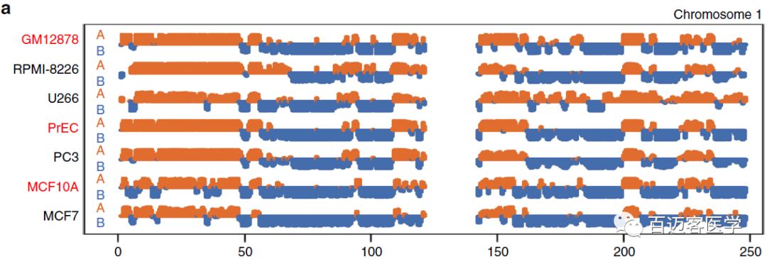 結(jié)合Hi-C、RNA-seq數(shù)據(jù),作者對(duì)MM細(xì)胞與淋巴母細(xì)胞樣B細(xì)胞系(GM12878)進(jìn)行了比較,發(fā)現(xiàn)與正常B細(xì)胞相比,大多數(shù)基因組區(qū)域在MM細(xì)胞中保持相同的compartments。共有8%的基因組區(qū)域從正常B細(xì)胞的compartment?A在MM細(xì)胞中轉(zhuǎn)換為compartment?B,并與下調(diào)基因表達(dá)相關(guān)。24%的基因組區(qū)域從compartment?A轉(zhuǎn)換為compartment?B,并與上調(diào)基因表達(dá)相關(guān)。