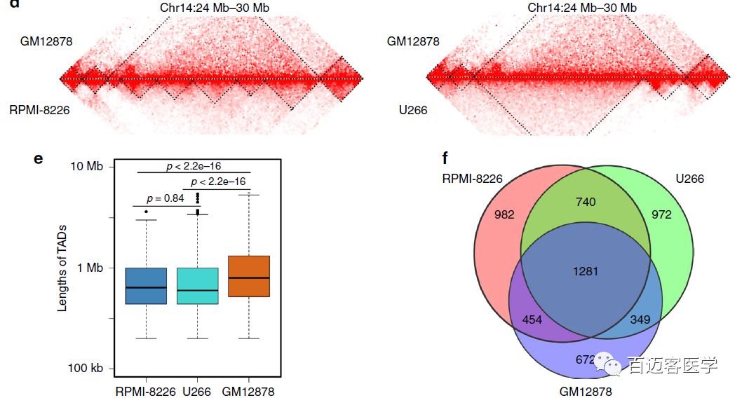 此外,GM12878、RPMI-8226和U266細(xì)胞中分別識(shí)別出了2756、3457和3342個(gè)TAD,TAD大小中值分別為800?kb、600?kb和640 kb。兩種MM細(xì)胞TAD數(shù)量較B細(xì)胞均增加1.2倍,且MM細(xì)胞TAD長(zhǎng)度較小。作者在3個(gè)樣本中鑒定出1281個(gè)保守TAD(TAD重疊超過(guò)70%),而僅在2個(gè)MM細(xì)胞存在的保守TAD有740個(gè)。