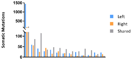 2、研究者也對13對雙側(cè)卵巢癌(synchronous bilateral ovarian cancer,SBOC)進行了測序,評估腫瘤克隆進化,以確定左右兩側(cè)腫瘤是否獨立地作為2個不同的腫瘤,還是分別代表原發(fā)性和轉(zhuǎn)移性腫瘤。分析表明,體細胞突變在2側(cè)腫瘤廣泛共享,所有病例中均顯示2側(cè)腫瘤起源于共同的祖先。