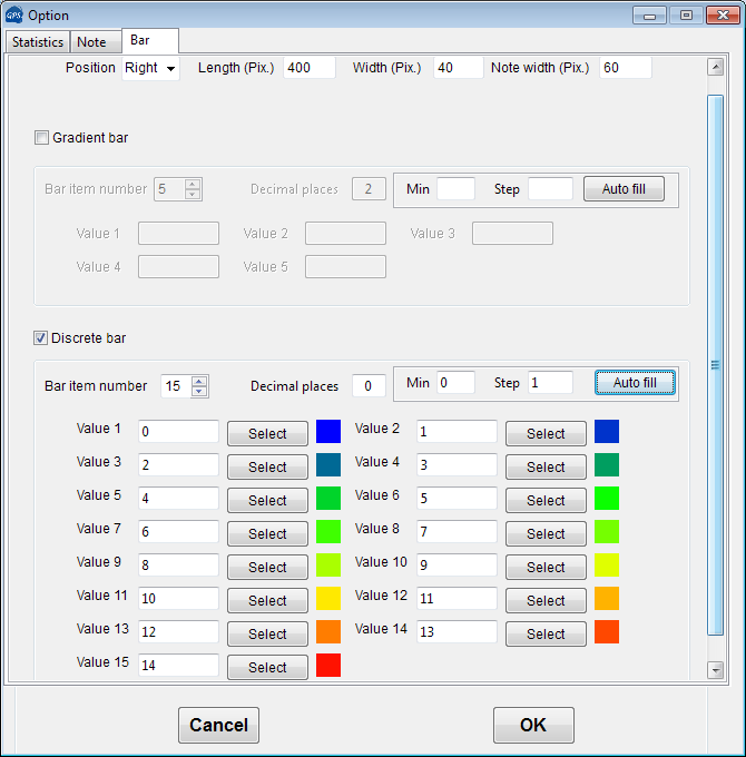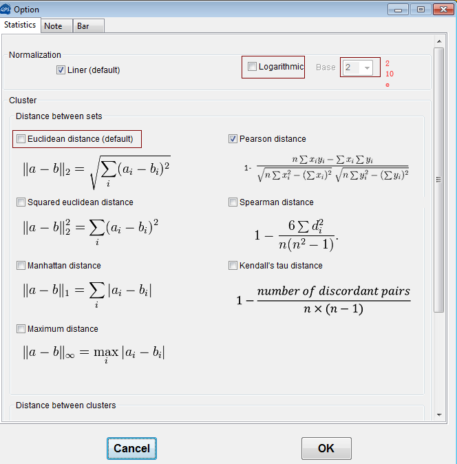 定義顏色標(biāo)尺連續(xù)或不連續(xù),右鍵Set up bar;Set up statistic: 設(shè)置繪制此熱圖使用到的數(shù)學(xué)上的屬性(歸一化和聚類(lèi)方法),一般二代數(shù)據(jù)選擇對(duì)數(shù)歸一化方式。