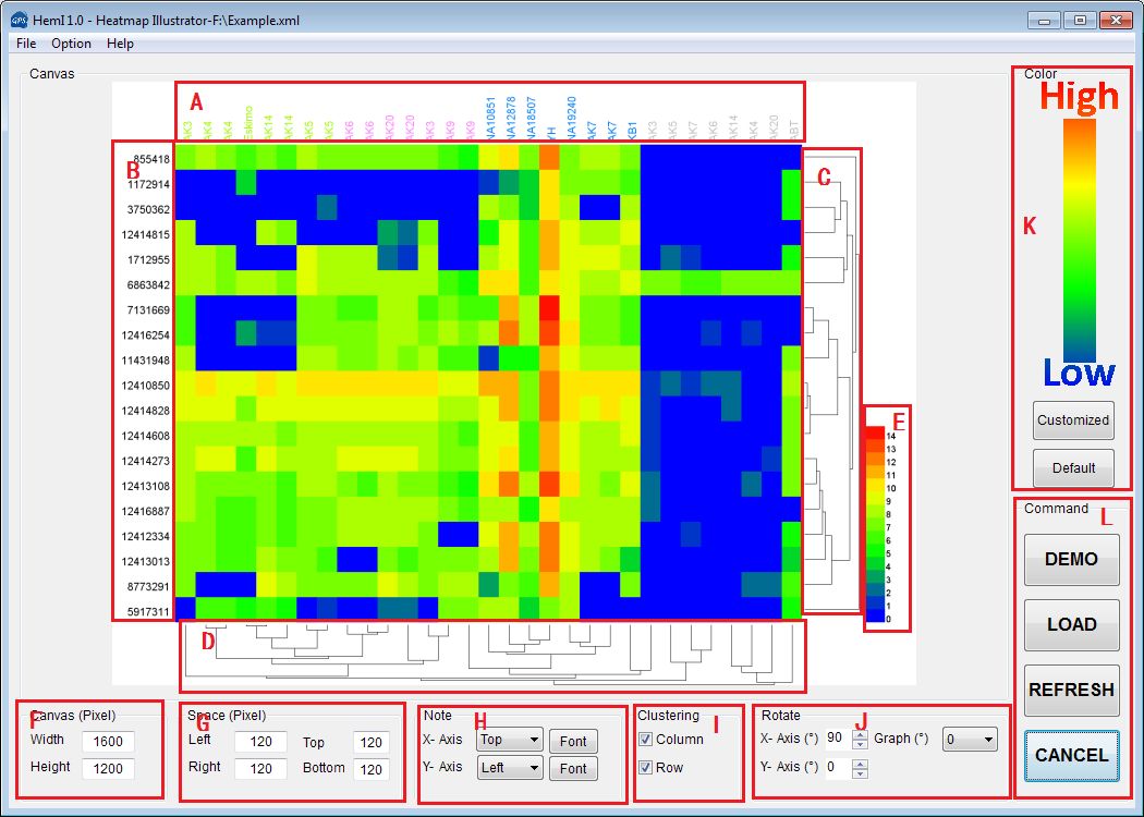 A: 列標(biāo)題。B: 行標(biāo)題。C: 行聚類(lèi)效果。D: 列聚類(lèi)效果。E: 顏色標(biāo)尺。F: 畫(huà)布大小(像素)。G: A (頂部)/D (底部) 的高度和B (左側(cè))/C (右側(cè))的寬度。(像素)