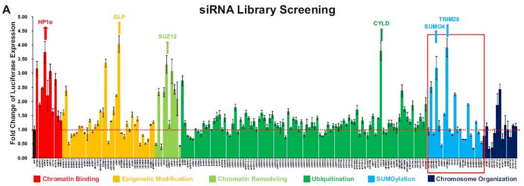 為了確定可能導(dǎo)致HIV-1抑制和潛伏的細(xì)胞靶點(diǎn),作者定制了siRNA文庫(kù)在ZM-bl細(xì)胞系中進(jìn)行高通量篩選,該文庫(kù)靶向細(xì)胞核內(nèi)的幾種細(xì)胞途徑的182個(gè)基因,包括chromatin binding, epigenetic modification, chromatin remodeling, ubiquitination, SUMOylation 和 chromosome organization。分析敲除各靶標(biāo)基因后熒光素酶的表達(dá)水平變化(以siNC為對(duì)照),許多蛋白質(zhì)對(duì)應(yīng)的熒光素酶表達(dá)升高,表明這些蛋白限制HIV-1啟動(dòng)子的活性,最明顯包括HP1α、GLP、SUZ12和CYLD,其已被鑒定為抑制HIV-1轉(zhuǎn)錄。其中,兩個(gè)較少見(jiàn)的SUMO化途徑基因TRIM28和SUMO4敲低后,顯著上調(diào)了HIV-1啟動(dòng)子活性。