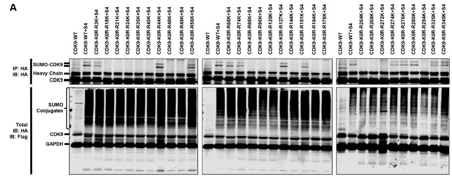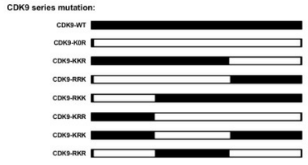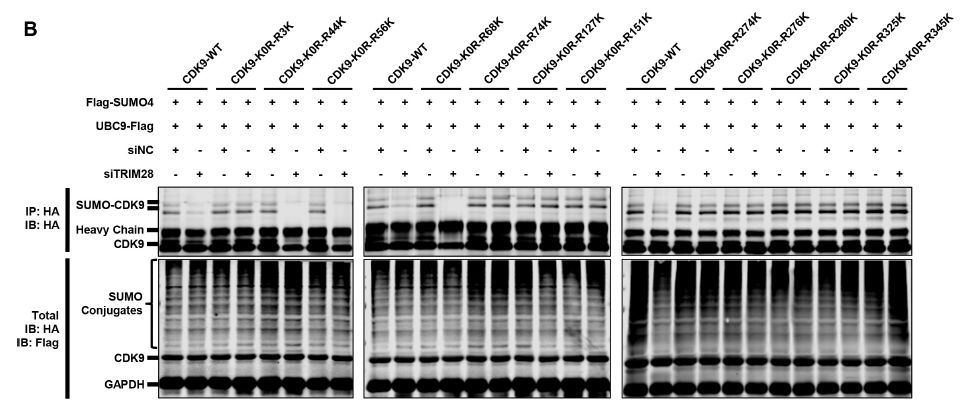 接下來(lái)作者試圖鑒定應(yīng)該在CDK9?賴(lài)氨酸殘基上發(fā)生的SUMO化位點(diǎn)。賴(lài)氨酸突變實(shí)驗(yàn)結(jié)果:CDK9-K0R突變體含有所有賴(lài)氨酸變?yōu)榫彼岬耐蛔?,完全中止了CDK9被SUMO化的能力;其他CDK9突變體仍然能夠通過(guò)TRIM28進(jìn)行SUMO化,這表明在整個(gè)CDK9序列中可能存在多個(gè)SUMOylation位點(diǎn)。采用基于CDK9-K0R全突變體的逆轉(zhuǎn)突變策略,發(fā)現(xiàn)CDK9上的幾個(gè)賴(lài)氨酸顯著SUMO化。其中,多個(gè)SUMO化位點(diǎn)與CDK9 C-末端自身磷酸化位點(diǎn)相鄰,據(jù)報(bào)道這些位點(diǎn)是Tat-P-TEFb與TAR RNA高親和力結(jié)合所必需的,即?SUMO化可以通過(guò)阻止相鄰的磷酸化來(lái)降低結(jié)合能力。