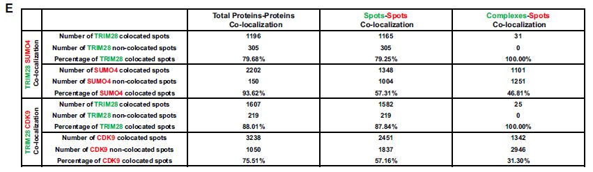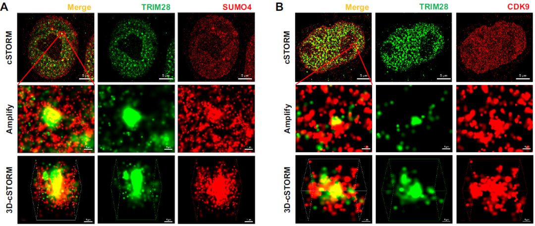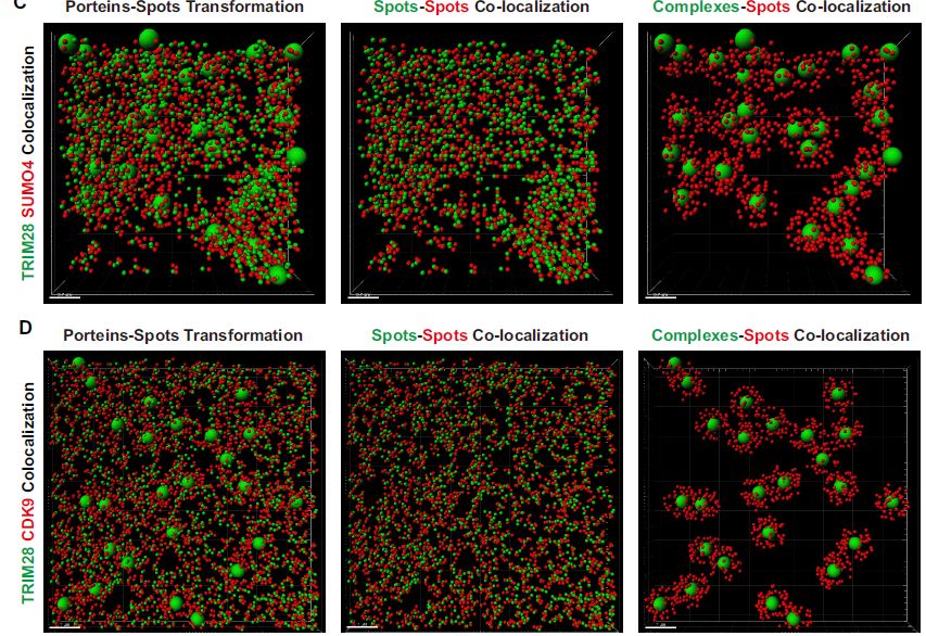 為了確定TRIM28是否與CDK9結(jié)合,作者使用超分辨率的連續(xù)隨機(jī)光學(xué)重建顯微鏡(cSTORM)來(lái)研究分辨率為20nm二者間的三維(3D)共定位。TRIM28存在于細(xì)胞核中,與點(diǎn)狀SUMO4共定位。放大視圖和3D-cSTORM,發(fā)現(xiàn)SUMO4蛋白被TRIM28富集并形成大斑點(diǎn)。CDK9存在于細(xì)胞核內(nèi)的分散點(diǎn)中,但仍發(fā)現(xiàn)CDK9與TRIM28共定位。與SUMO4類(lèi)似,CDK9蛋白被TRIM28富集并包圍TRIM28。近80%的TRIM28斑點(diǎn)或復(fù)合物與94%的SUMO4斑點(diǎn)共定位,88%的TRIM28斑點(diǎn)或復(fù)合物與76%的CDK9斑點(diǎn)共定位。
