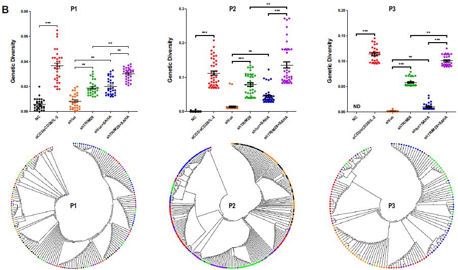 之后作者試圖確定TRIM28的敲低是否在接受抑制性cART療法至少6個(gè)月的HIV-1感染者的靜息CD4+T細(xì)胞中重新激活潛伏的HIV-1?;诩?xì)胞內(nèi)HIV-1 RNA的定量,表明用αCD3/αCD28刺激顯著誘導(dǎo)HIV-1的表達(dá)。TRIM28敲低重新激活了與HDAC抑制劑SAHA相似量的HIV-1 RNA表達(dá)。在將TRIM28敲低與SAHA組合后,重新激活效果更顯著。同樣,SUMO4敲低和SAHA添加的組合使用可以重新激活比單獨(dú)使用更多的HIV-1 RNA表達(dá)。雖然TRIM28單獨(dú)缺失重新激活相似數(shù)量的具有SAHA的遺傳多樣化HIV-1表達(dá),但TRIM28敲低和SAHA的組合重新激活了更多遺傳多樣化的HIV-1表達(dá)。