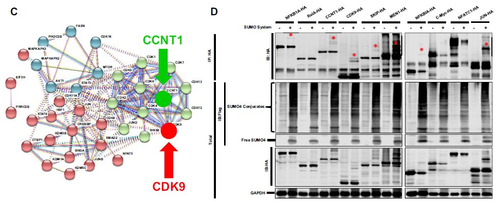 為了鑒定由TRIM28 SUMO化的候選底物,作者進(jìn)行了全局位點(diǎn)特異性SUMO化質(zhì)譜(SUMO-MS),鑒定了1,329個(gè)SUMO化蛋白,并構(gòu)建了相互作用置信度為0.7的STRING互作網(wǎng)絡(luò),MCODE分析發(fā)現(xiàn)STRING核心網(wǎng)絡(luò)可以聚類(lèi)成12個(gè)亞群。GO分析發(fā)現(xiàn)細(xì)胞和代謝過(guò)程是SUMO化蛋白可能參與的前兩個(gè)生物過(guò)程。通過(guò)k-means聚類(lèi)特異性地將轉(zhuǎn)移酶和轉(zhuǎn)錄因子聚類(lèi),并用STRING分析進(jìn)行可視化,發(fā)現(xiàn)許多候選蛋白對(duì)于HIV-1表達(dá)是關(guān)鍵的,例如JUN、JUNB、JUND、mTOR、STAT3、Cyclin T1(CCNT1)和CDK9。將SUMO化蛋白鑒定的顯著性閾值調(diào)低到10^-8,CDK9仍然排名靠前。作者在體外驗(yàn)證了全局位點(diǎn)特異性SUMO-MS的可靠性。