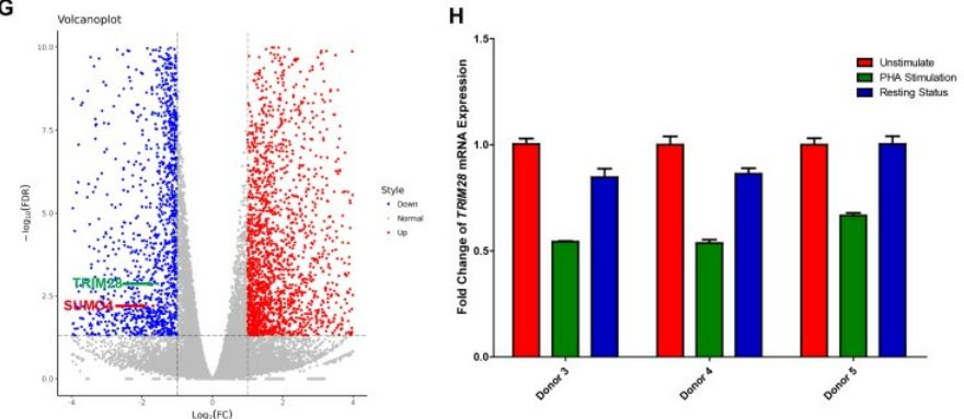 通過(guò)實(shí)驗(yàn)發(fā)現(xiàn)si-TRIM28過(guò)表達(dá)抑制了HIV-1啟動(dòng)子活性的基礎(chǔ)水平,并以劑量依賴(lài)的方式挽救了HIV-1抑制;當(dāng)與HIV-1 Tat和TNFα組合過(guò)表達(dá)時(shí),上調(diào)更顯著;TRIM28在多種細(xì)胞系和原代細(xì)胞中普遍表達(dá)。為搜索HIV-1潛伏相關(guān)基因,作者利用RNA-Seq比較未刺激和PHA刺激的原代CD4+?T細(xì)胞中的基因表達(dá)作為補(bǔ)充實(shí)驗(yàn),TRIM28在未刺激的原代CD4+?T細(xì)胞中高表達(dá),并在PHA激活后下調(diào)。當(dāng)活化的CD4+?T細(xì)胞恢復(fù)到靜止?fàn)顟B(tài)時(shí),TRIM28的表達(dá)再次上調(diào)。為了測(cè)試TRIM28是否有助于HIV-1潛伏,在HIV-1潛伏細(xì)胞系J-Lat 10.6以及其他HIV潛伏細(xì)胞系模型(J-Lat 6.3/8.4/9.2和15.4)中敲低了TRIM28,發(fā)現(xiàn)TRIM28的缺失上調(diào)了HIV-1的表達(dá)。此外,當(dāng)補(bǔ)充廣泛定義的LRA:組蛋白去乙?;福℉DAC)抑制劑SAHA或BET結(jié)構(gòu)域抑制劑JQ-1時(shí),HIV-1重新激活增強(qiáng)得更高。