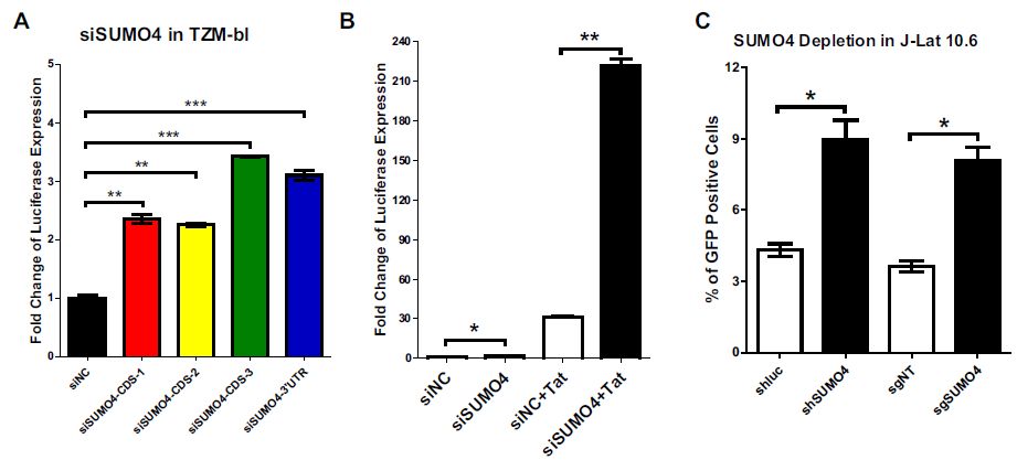 前面siRNA文庫(kù)篩選中,SUMO4缺失比其他SUMO旁系同源物缺失更顯著上調(diào)HIV-1啟動(dòng)子活性。當(dāng)與HIV-1 Tat過(guò)表達(dá)組合時(shí),上調(diào)更顯著,其現(xiàn)象與TRIM28實(shí)驗(yàn)中觀(guān)察到的相似。SUMO4的敲低或敲除也能夠在J-Lat 10.6中重新激活潛在的假HIV-1。原代CD4+?T細(xì)胞被PHA刺激后,SUMO4的表達(dá)下調(diào),恢復(fù)到靜止期后達(dá)SUMO4表達(dá)恢復(fù)到基礎(chǔ)水平。