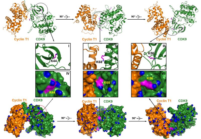 為了進(jìn)一步確定哪些位點(diǎn)確實(shí)僅被TRIM28 SUMO化,作者敲除了內(nèi)源性TRIM28并測(cè)試了上述鑒定候選位點(diǎn)的SUMO化潛力,發(fā)現(xiàn)Lys44、Lys56和Lys68的SUMO 化信號(hào)在缺乏內(nèi)源性TRIM28時(shí)完全消失,進(jìn)一步支持這些位點(diǎn)被TRIM28特異性SUMO化。直接分析富集的SUMO-CDK9的靶特異性SUMO-MS也證實(shí)了該結(jié)果。Lys44的乙?;瞧浼っ富钚运匦璧?,其他2個(gè)SUMO化位點(diǎn)Lys56和Lys68在CDK9和細(xì)胞周期蛋白T1的相互作用區(qū)域內(nèi)。SUMO蛋白是多肽大分子,它的存在可以形成空間位阻,從而阻止P-TEFb復(fù)合物的形成。