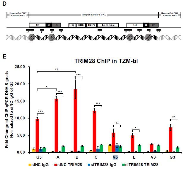先前已鑒定TRIM28通過(guò)募集HDAC1以使HIV-1整合酶去乙酰化來(lái)抑制HIV-1整合。在TZM-bl和J-Lat 10.6細(xì)胞系中進(jìn)行TRIM28的染色質(zhì)免疫沉淀(ChIP)實(shí)驗(yàn),以研究其與整合的HIV-1 DNA的可能關(guān)聯(lián)。結(jié)果表明:TRIM28在HIV-1 LTR上顯著富集,不受TNFα信號(hào)傳導(dǎo)的影響。接下來(lái),探究了TRIM28缺失是否會(huì)影響HIV-1 LTR的表觀(guān)遺傳狀態(tài),敲除TRIM28后H3K9me2和H3K9me3顯著減少,以及H3K4me3和H3K9Ac顯著增加,也誘導(dǎo)H3K27me3輕微下調(diào),表明TRIM28通過(guò)控制抑制性表觀(guān)遺傳修飾來(lái)抑制HIV-1表達(dá)并導(dǎo)致HIV-1潛伏期。