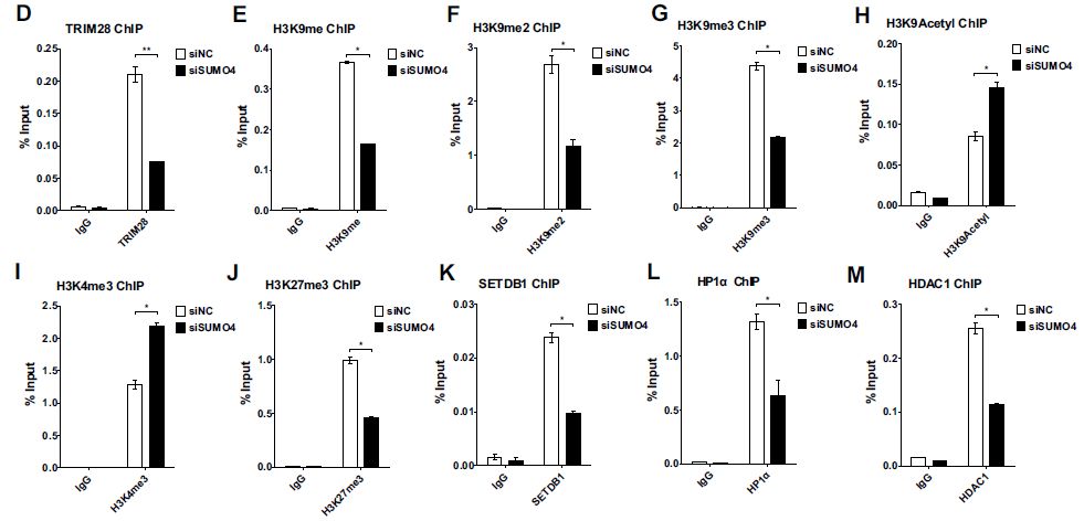 接下來(lái)探究了SUMO4是否可以影響TRIM28的功能和HIV-1啟動(dòng)子的表觀(guān)遺傳狀態(tài):SUMO4敲低后,超過(guò)一半的TRIM28從HIV-1 LTR中丟失,表明TRIM28在HIV-1 LTR上的富集可能是部分SUMOylation依賴(lài)性的;SUMO4敲低后H3K9me、H3K9me2和H3K9me3在HIV-1 LTR上顯著降低,以及H3K9甲基化’writer’ SETDB1和’reader’ HP1α顯著降低;H3K9乙?;虷3K4me3的顯著上調(diào)和HDAC1的下調(diào),這與先前報(bào)道TRIM28以SUMO化依賴(lài)性方式募集SETDB1、HP1α和HDAC1一致;H3K27me3在HIV-1 LTR上也降低。一些多梳抑制復(fù)合物2(PRC2)組分如EZH2和SUZ12(H3K27me3的主要’writer’)可能被SUMO4 SUMO化,導(dǎo)致修飾功能的增強(qiáng)。