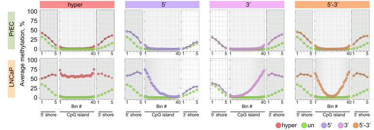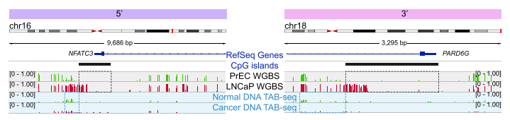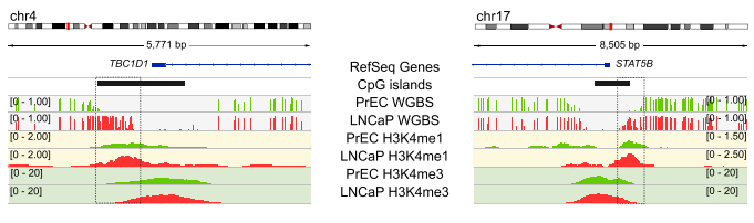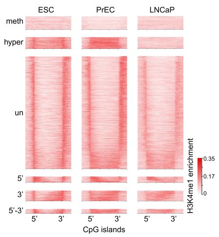 采用chip-seq數(shù)據(jù),分析H3K4me1在癌癥CpG島超甲基化中的富集方式。H3K4me1高富集于hESCs CpG島的body區(qū),在癌癥中呈現(xiàn)廣泛超甲基化。相反,癌癥中未甲基化的CpG島,在hESCs中表現(xiàn)為邊界雙峰富集及島區(qū)域降低。并且,文章發(fā)現(xiàn)一種hESCs中不對稱的H3K4me1富集模式,在對應5’或3’內CpG島邊界,易于癌癥中DNA甲基化。通過可視化圖展現(xiàn)了候選的CpG島,顯示癌癥中5’和3’的甲基化堆積,可以由正常前列腺細胞中H3K4me1預先標記。