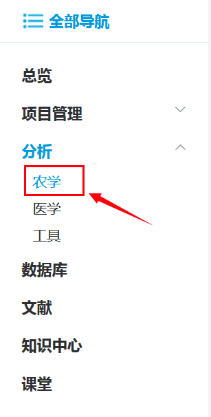首先,您需要登錄到百邁客云平臺網(wǎng)址(http://www.biocloud.net/),點擊全部導(dǎo)航->分析->農(nóng)學(xué)