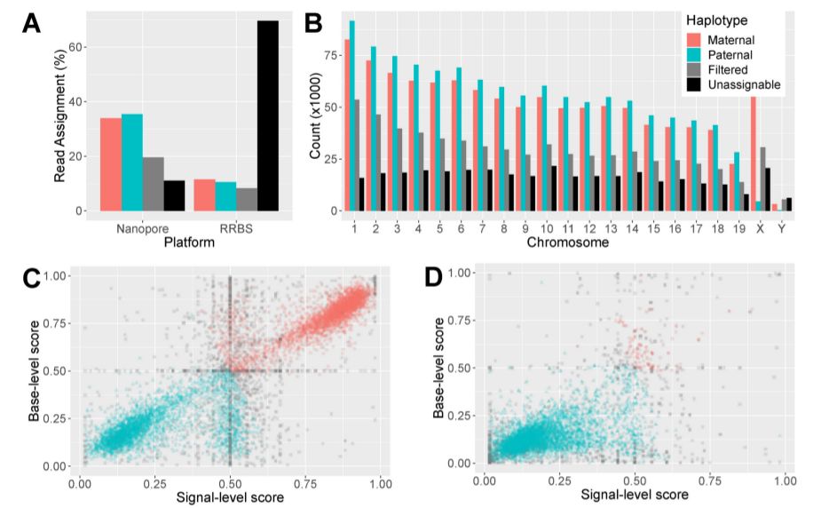 今年2月份發(fā)表在核酸研究上的一篇工作就采用了10X左右的Nanopore測序的數(shù)據(jù)進行基因印記的相關(guān)研究。作者采用兩種方法(Basecall method基于Fastq數(shù)據(jù),Signal method基于原始電信號)對Nanopore測序的read進行單倍型分配,并識別父母本等位差異的甲基化區(qū)域。這些等位差異的甲基化區(qū)域中有部分是已知的印記控制區(qū),同時結(jié)果與RNA-seq等位特異表達和RRBS數(shù)據(jù)結(jié)果吻合。因此作者認為那些新的等位差異甲基化區(qū)域可能是新的印記控制區(qū)。