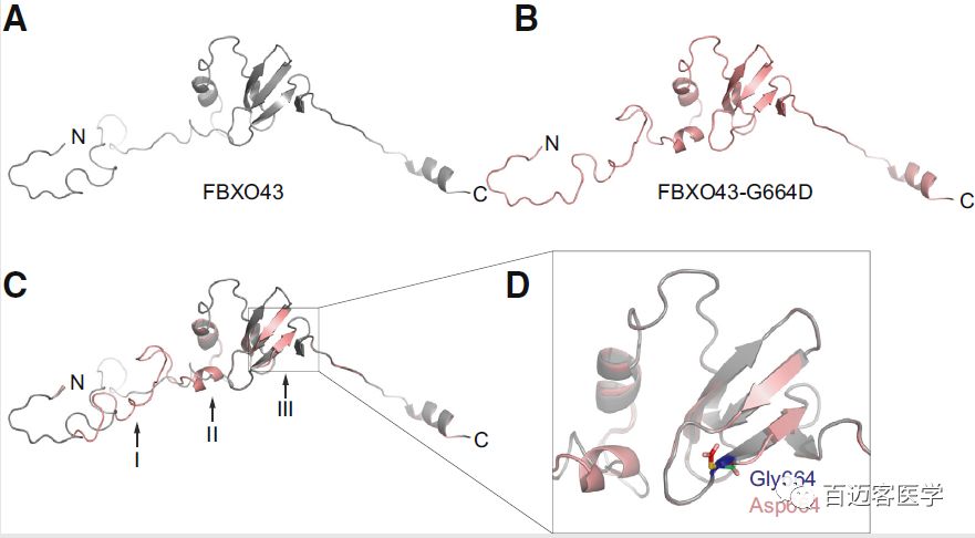 FBXO43(c.1991C>T)非同義突變導(dǎo)致FBXO43蛋白664殘基從非極性氨基酸(Gly甘氨酸)轉(zhuǎn)變?yōu)閹ж?fù)電荷的氨基酸(Asp天冬氨酸)(G664D)。蛋白質(zhì)二級結(jié)構(gòu)通過in silico結(jié)構(gòu)模型預(yù)測,與野生型相比,具有2個明顯縮短的β-折疊(殘基654-668)、額外產(chǎn)生的α-螺旋(殘基610-613)和明顯變化的loop(殘基583-618)。