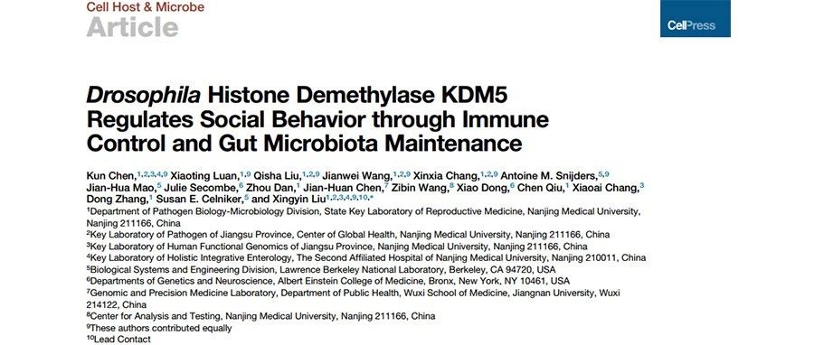 該研究從遺傳、環(huán)境和免疫因素進(jìn)行研究為“孤獨(dú)癥”的預(yù)防和治療提供了新思路。劉老師課題組以果蠅作為模型動物,發(fā)現(xiàn)遺傳因素調(diào)控了固有的免疫信號通路,進(jìn)而造成了以腸道菌群結(jié)構(gòu)為代表的內(nèi)環(huán)境因素紊亂,導(dǎo)致免疫因素的抑制性神經(jīng)遞質(zhì)5-羥色胺濃度升高。然而,抗生素或植物乳桿菌飼喂以及抑制固有免疫的過度激活均可改善了KDM5基因功能缺乏導(dǎo)致的果蠅社交孤獨(dú)樣的“社交”行為、壽命和細(xì)胞表型,最終揭示了組蛋白去甲基化酶KDM5通過免疫系統(tǒng)和腸道菌群調(diào)節(jié)果蠅社交行為的機(jī)制。
