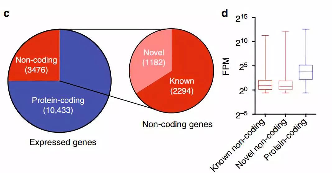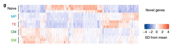 從LCMV感染小鼠中分離病毒特異性的CD8+T細胞亞群,對不同類型的細胞進行RNA-seq。包括初始T細胞、終末分化效應T細胞(short-livedterminal effector ,TE)、記憶前體T細胞(memory precursor ,MP)、中心記憶T細胞(central memory ,CM) 、效應記憶T細胞(effector memory ,EM)?;跀?shù)據(jù)組裝分析,共鑒定到13909個unique genes,75%是蛋白編碼基因,25%是非編碼。在非編碼基因中,三分之一在數(shù)據(jù)庫中未收錄,因為認為是新基因。這些新基因比已注釋非編碼基因有較高的表達水平,但這兩類基因均比編碼基因低表達。采用CPAT進行編碼潛能分析,大部分新轉錄本包括單個外顯子,不到25%的新轉錄本包括2個及以上外顯子。雖然不具有蛋白編碼潛能,但大部分新基因在CD8+T細胞分化過程中表現(xiàn)出特異性,包括記憶細胞中的特異性表達。