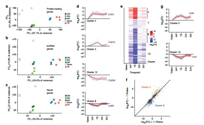 由于在CD8+T細胞分化過程中表現(xiàn)出來的差異表達,進一步通過PCA分析是否可以對不同亞群細胞分類。結果表明編碼基因、非編碼和新基因均可以分類。其中組裝得到的新基因分類結果與編碼基因分類結果一致,說明這些新基因對T細胞的分化及功能的重要性。為進一步鑒定特異性lncRNA,篩選具有類似表達模式的差異基因。鑒定出14個差異表達的cluster,其中非編碼與編碼并未表現(xiàn)出cluster分離,表明二者有相似的表達過程。比如一些非編碼基因在CD8+T細胞激活后表達上調或下調,在記憶期維持效應水平,與編碼基因Cd44和Cd200類似。第8天的MP和TE細胞相比,差異lncRNA存在于一些cluster中(clusters 4, 8, and 13 ),表明lncRNA可能涉及T細胞早期分化命運。