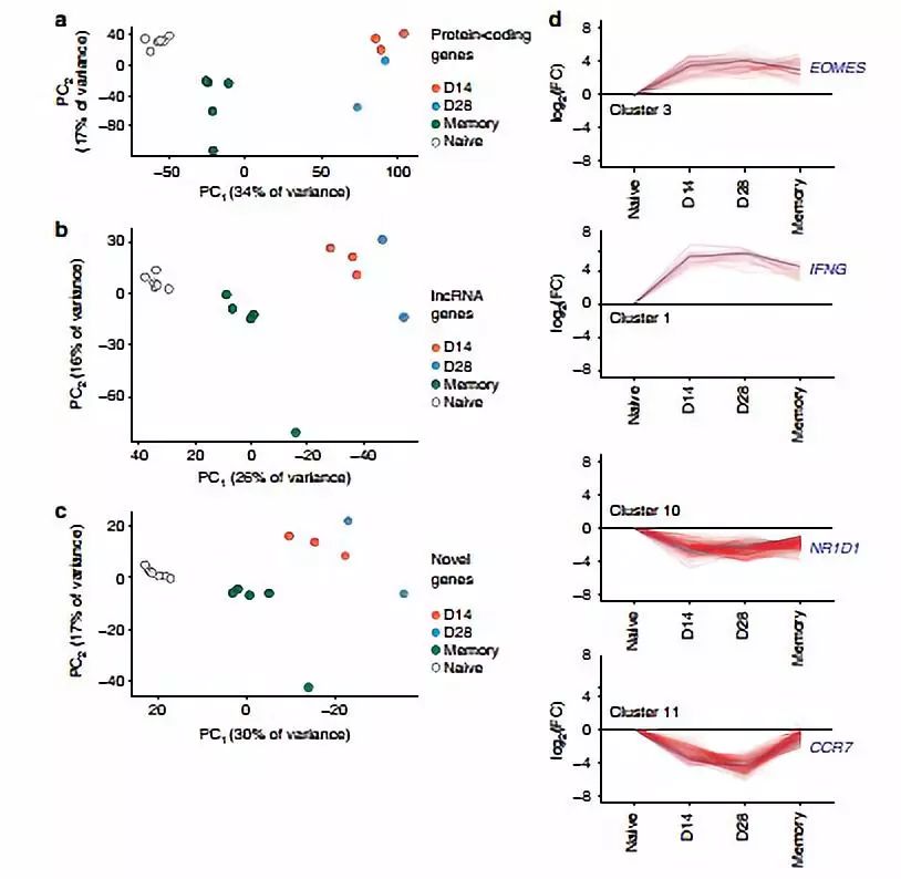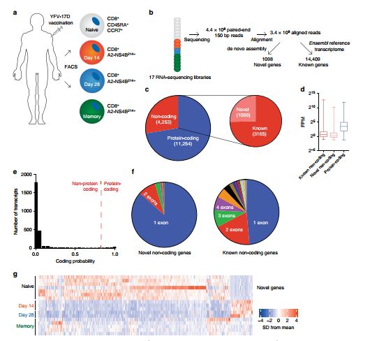 基于之前健康志愿者的測序數(shù)據(jù)(采用YFV-17D黃熱疫苗,分選CD8+T細胞,收集初始T細胞,14天CD8+T細胞、28天CD8+T細胞、記憶細胞),進行轉錄組分析。鑒定出已注釋的3165個非編碼轉錄本,1098個未注釋的。與小鼠數(shù)據(jù)相比,人數(shù)據(jù)中也表現(xiàn)出編碼基因表達高于非編碼基因。同樣許多鑒定的新轉錄本是單外顯子,編碼潛能低于鼠鑒定的轉錄本。與小鼠數(shù)據(jù)類似,許多新轉錄本在T細胞分化中表現(xiàn)出特異性。