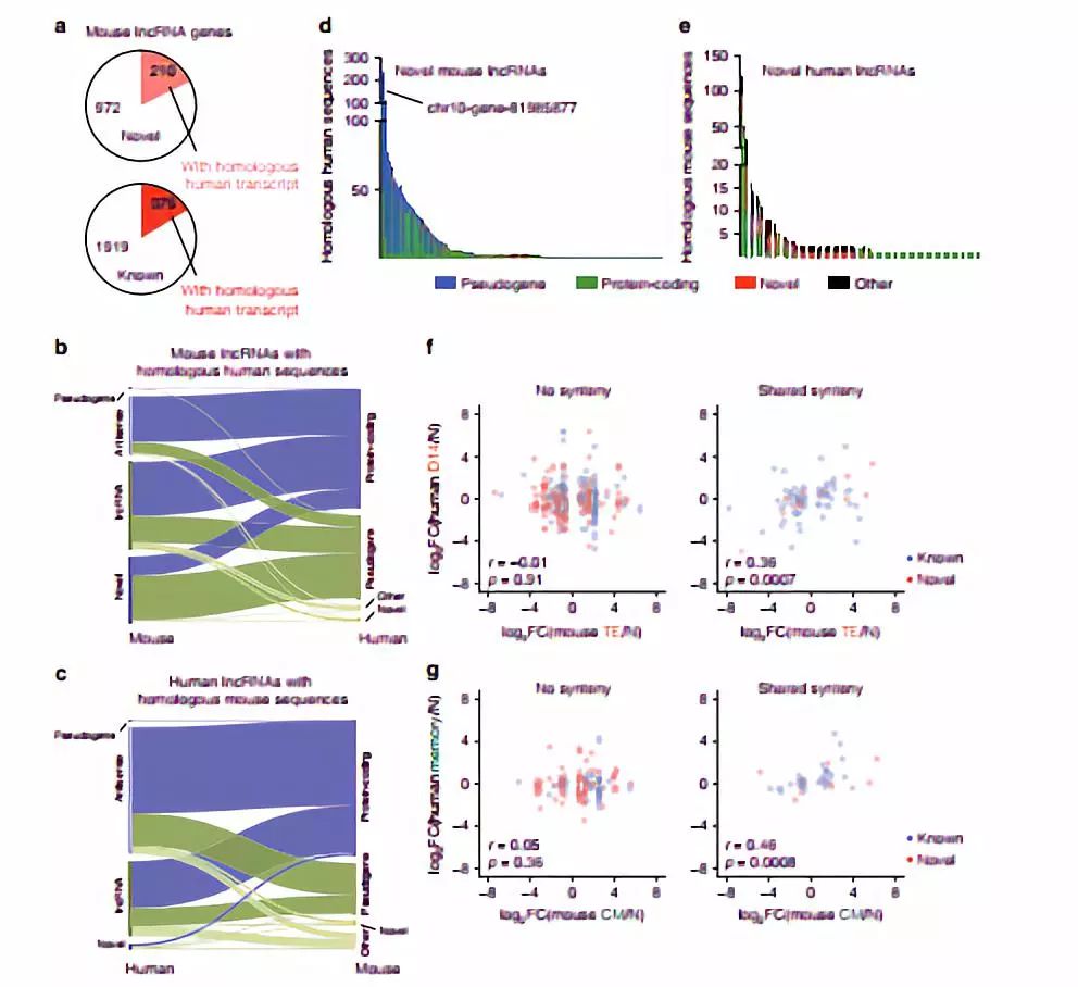 更重要的是,小鼠和人在效應及記憶T細胞分化中已觀察到一些相似的基因程序。這些研究集中于編碼轉錄本的水平,但目前關于非編碼轉錄本在這一過程中的表達變化鮮有報道。作者基于之前工作采用RNA-seq展開研究,以鑒定響應病毒感染的人和小鼠CD8 +?T細胞中長非編碼RNA(lncRNA)表達的變化。通過lncRNA測序研究,鑒定出上百條未注釋的lncRNA,基于表達分析可以將lncRNA對初始、效應和記憶CD8+T細胞亞群分類,意味著在抗原啟動分化過程中它們可能參與決定不同分化命運。通過小鼠與人類lncRNA表達數(shù)據(jù)的比較,發(fā)現(xiàn)具有保守性的lncRNA。