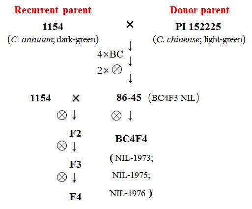 1. 群體構建:1154(深綠;C. annuum),PI 152225(淡綠;C. chinense);86-45(BC4F3 NIL,含來自PI152225的pc1區(qū)段)(圖 1.及圖 2.)