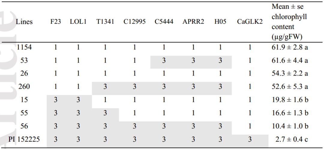 為進一步精細定位pc1,本研究對624個F2(1154 × NIL 86-45)單株標記分型以篩選QTL區(qū)域內的交換單株?;谇捌谘芯?,標記T1341與QTL peak連鎖最為緊密 (Brand et al., 2012),作者又在T1341附近開發(fā)出6個標記,在標記F23與H05間,共篩選出34個F4交換單株,可代表6種基因型組合,橫跨Chr.1:5cM的區(qū)間。為排除pc1pc10互作的影響,作者將所有交換單株的CaGLK2固定為1154等位基因。結果分析暗示,F23與LOL1是與QTL連鎖最為緊密的標記,因為line 15含PI 152225最短的導入片段且葉綠素含量顯著低于1154,而line 260在這2個標記間含1154等位且與1154葉綠素含量沒有顯著性差異。此外,lines 53與260在APRR2-like位點含有PI 152225等位,葉綠素含量卻與1154沒有顯著差異,暗示此基因(APRR2)在本研究中的遺傳背景下不影響葉綠素含量(表1.)。