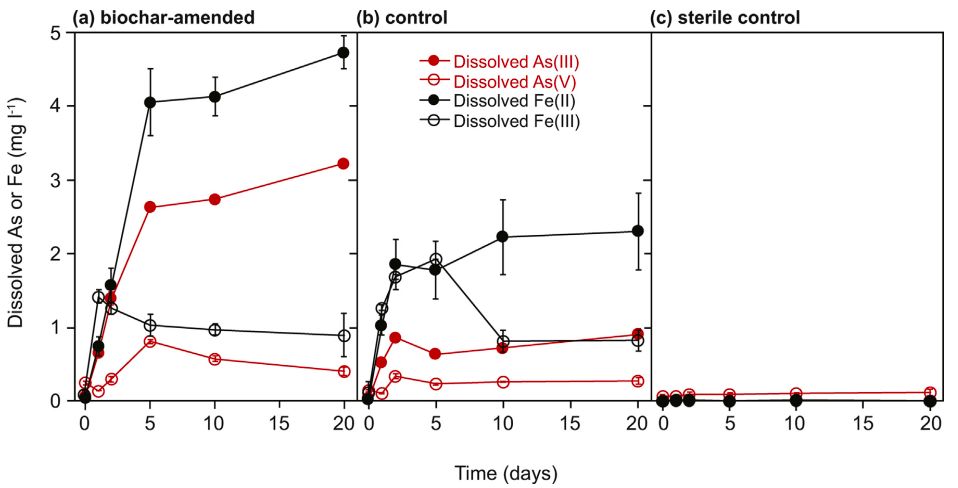 ?圖1. 不同孵育階段,生物炭修正(a)、無生物炭修正(b)和無菌(c)水稻土壤的釋放性砷As(III)/As(V)和鐵Fe(II)/Fe(III)的濃度。