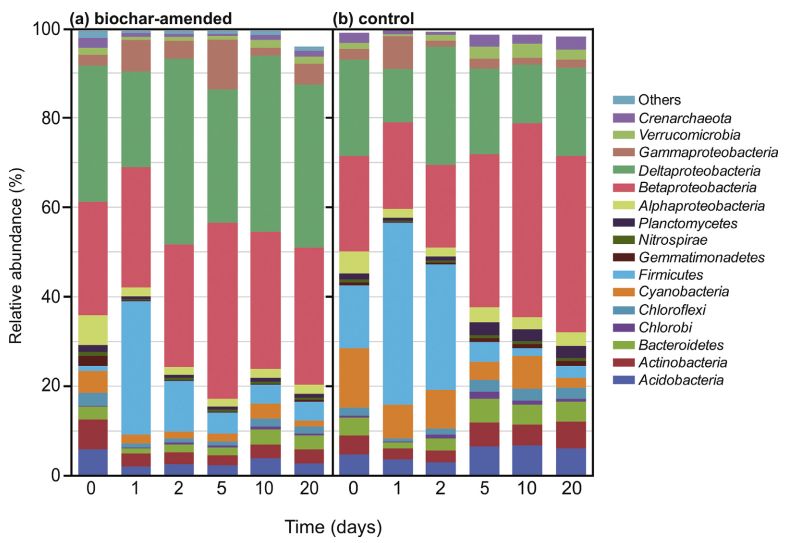 圖2. 生物炭修正(a)、無生物炭修正(b)水稻土壤的“門”和“綱”水平活性微生物的相對豐度。