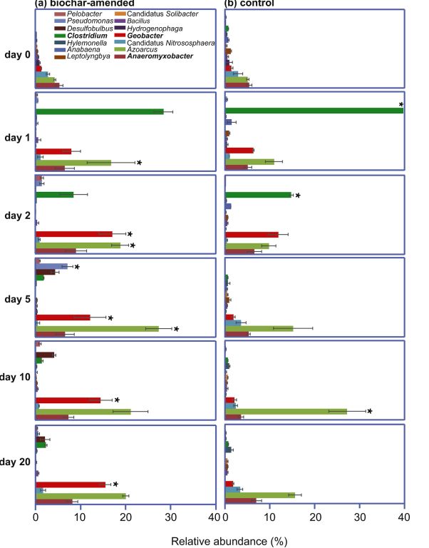 圖3. 生物炭修正(a)、無生物炭修正(b)水稻土壤的“屬”水平活性微生物的相對豐度差異比較(“*”號表示p<0.05。