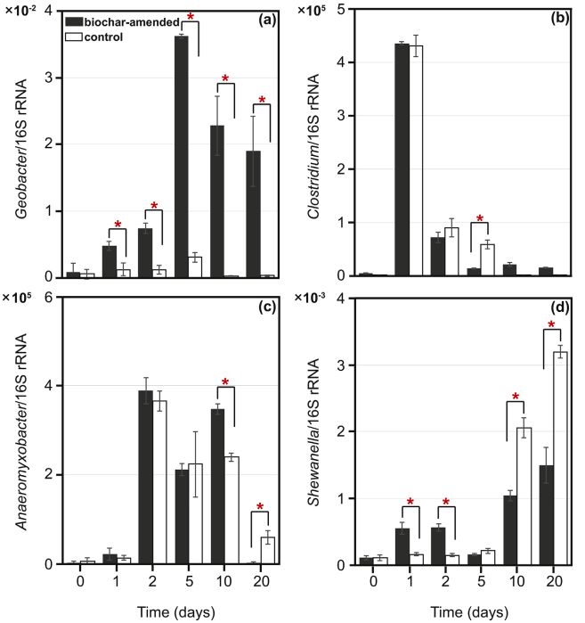 圖4. 生物炭修正與無生物炭修正的水稻土壤的(a):地桿菌(geobacter);(b)梭菌(clostridium);(c)厭氧粘細(xì)菌(Anaeromyxobacter)和(d)希瓦氏菌(Shewanella)的相對轉(zhuǎn)錄豐度。