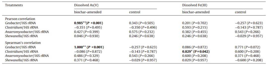 表1. 地桿菌(Geobacter)、?梭菌(Clostridium)、厭氧粘細(xì)菌(Anaeromyxobacter)和希瓦氏菌(Shewanella)的相對轉(zhuǎn)錄水平與釋放砷As(V)和鐵Fe(III)的Pearson和Speraman相關(guān)性檢驗.