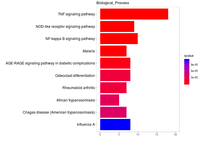 這個圖與一般的函數(shù)barplot畫出來的不一樣的地方在于它的顏色,這張圖里面的顏色反應(yīng)的是fdr的大小,是一個連續(xù)值,ggplot2可以將連續(xù)值映射到到顏色上,橫坐標(biāo)是通路中感興趣基因的個數(shù)。