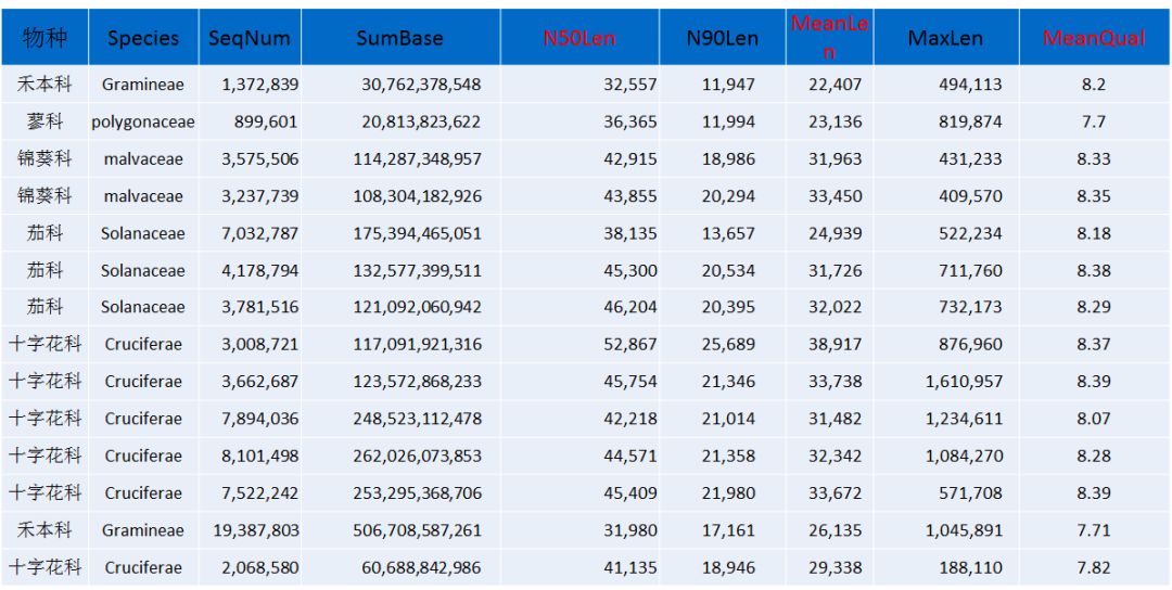 注:Species:分析的物種信息;SeqNum:各個長度范圍內(nèi)序列的數(shù)目;SumBase:指各個長度范圍內(nèi)序列的總長度;N50Len:reads N50長度;N90Len:readsN90長度;MeanLen:平均reads長度;MaxLen:最長reads長度;MeanQual:質(zhì)量值。