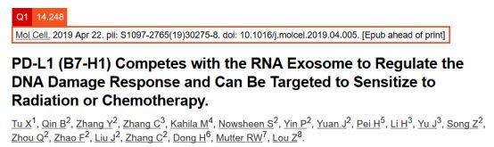 PD-L1(B7-H1)與RNA外切體競(jìng)爭(zhēng)調(diào)節(jié)DNA損傷反應(yīng),可作為對(duì)放療或化療敏感的靶標(biāo)