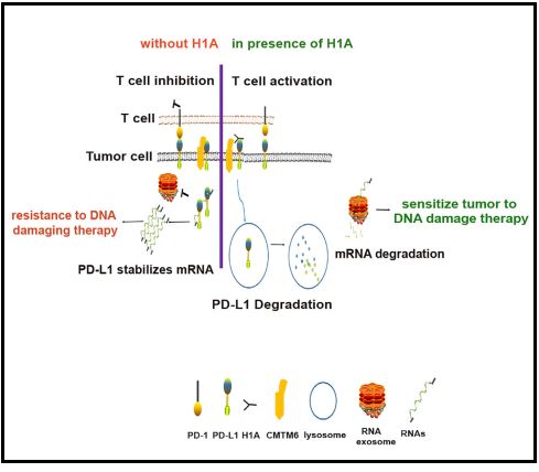 作者研究發(fā)現(xiàn)細(xì)胞內(nèi)PD-L1充當(dāng)RNA結(jié)合蛋白,其調(diào)節(jié)NBS1,BRCA1等其他DNA損傷相關(guān)基因的mRNA穩(wěn)定性。通過(guò)與RNA外切體的競(jìng)爭(zhēng),細(xì)胞內(nèi)PD-L1保護(hù)靶向RNA免于降解,從而增加細(xì)胞對(duì)DNA損傷的抗性。RNA免疫沉淀和RNA-seq實(shí)驗(yàn)證明PD-L1在全基因組中調(diào)節(jié)RNA穩(wěn)定性。此外,作者開(kāi)發(fā)了PD-L1抗體H1A,其消除了PD-L1與CMTM6的相互作用(CMTM6可保護(hù)PD-L1免受溶酶體降解),從而促進(jìn)PD-L1降解。細(xì)胞內(nèi)PD-L1可以是通過(guò)抑制DNA損傷和修復(fù)來(lái)增強(qiáng)癌癥中放療和化療功效的潛在治療靶標(biāo)。